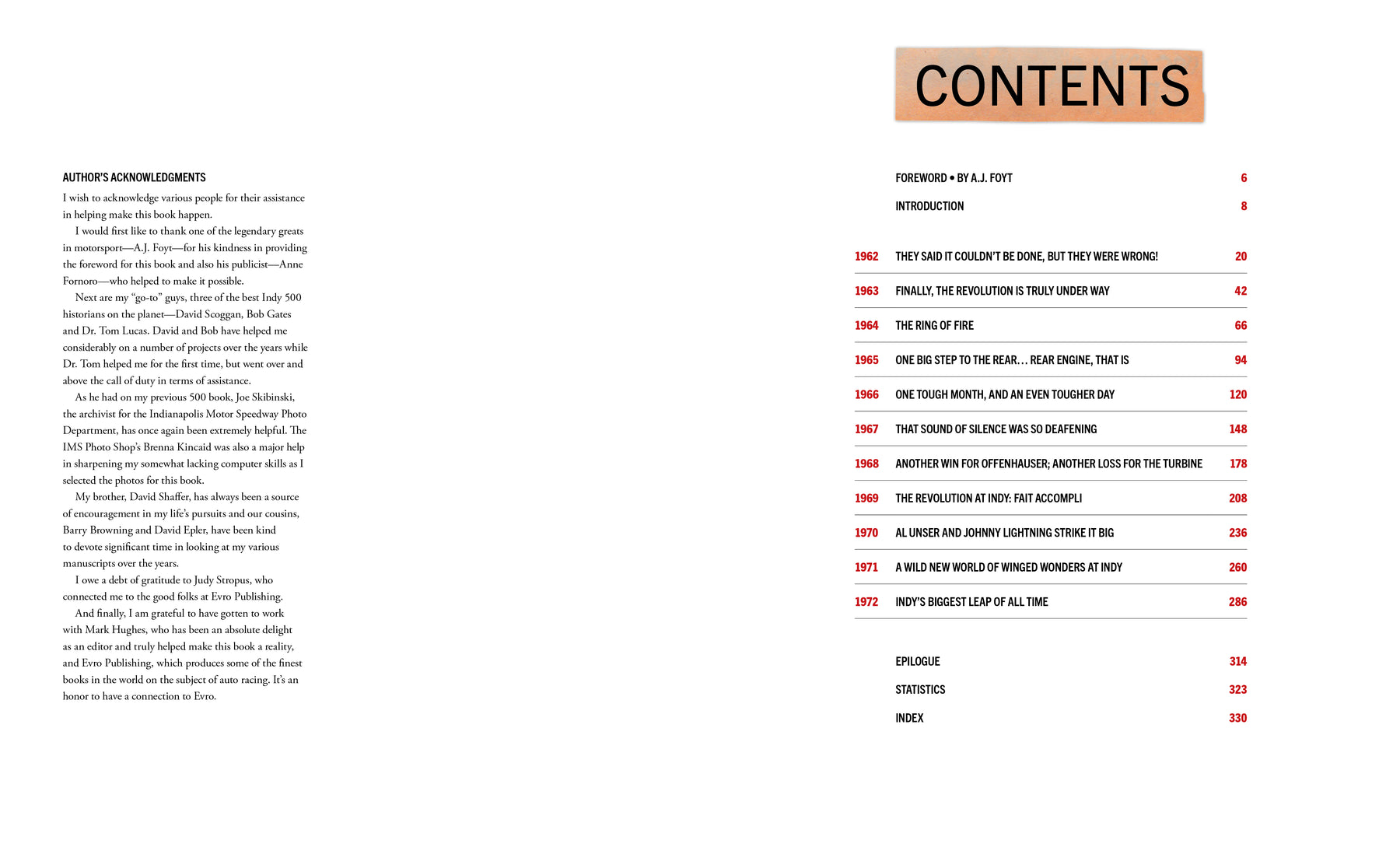 • Year-by-year coverage includes the technical developments behind rising speeds in a period that saw Formula One-inspired rear-engine chassis depose Indy’s traditional front-engine roadsters.