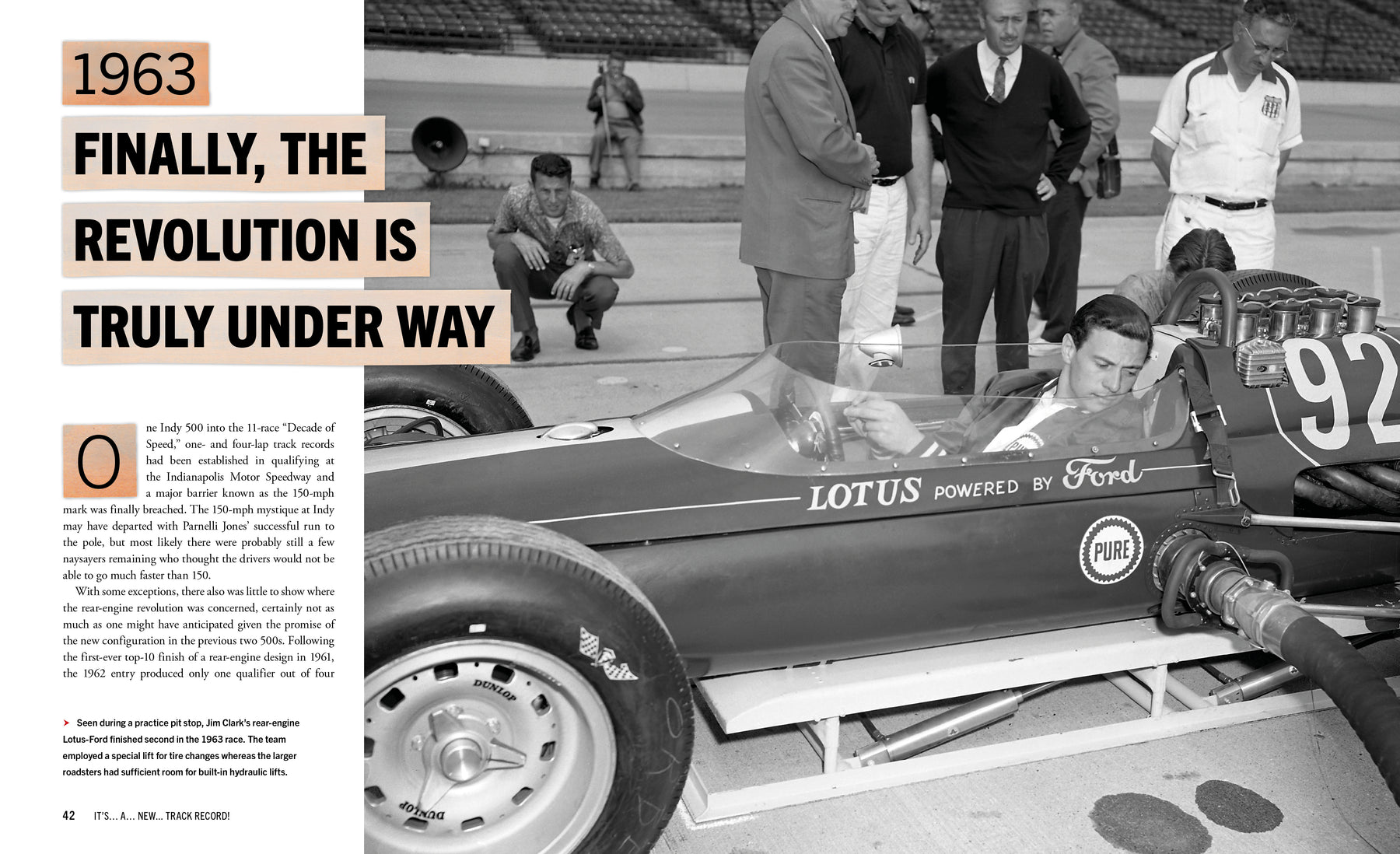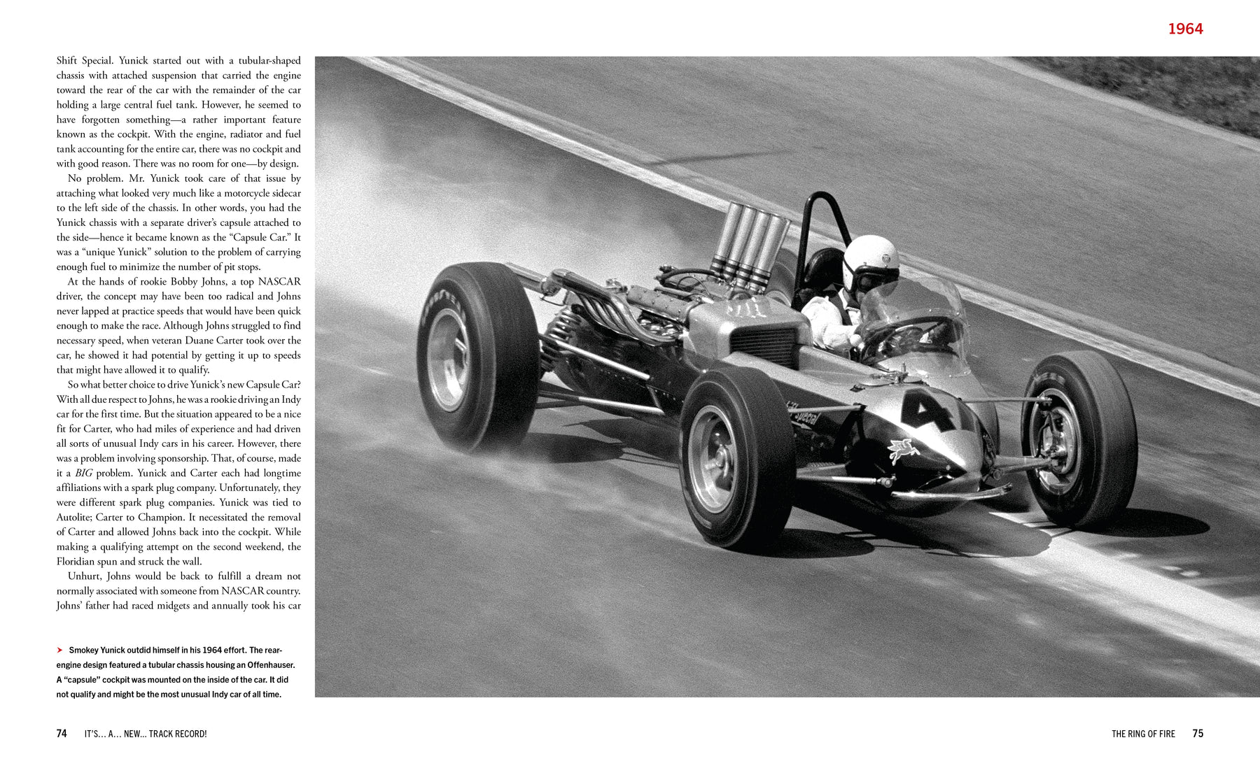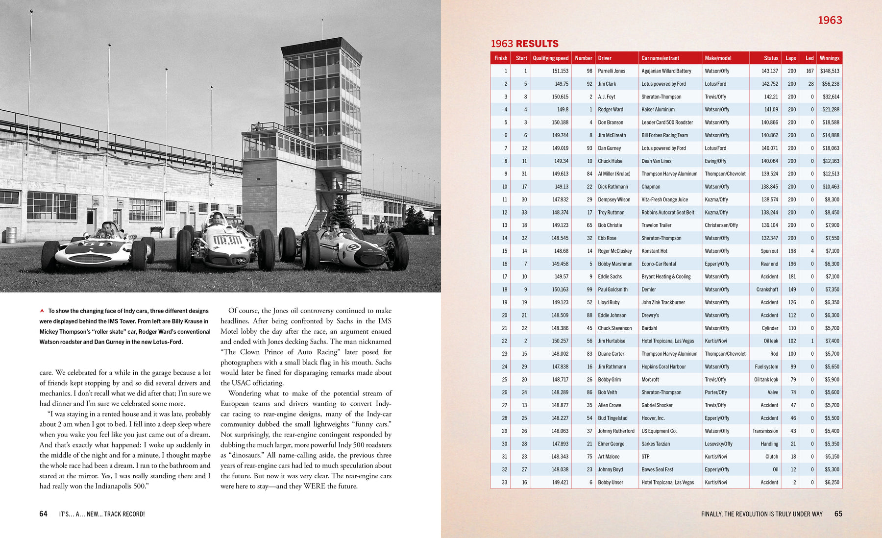 • The 1964 Indy 500 saw A.J. Foyt—writer of this book’s foreword—achieve the last win for a front-engine roadster.