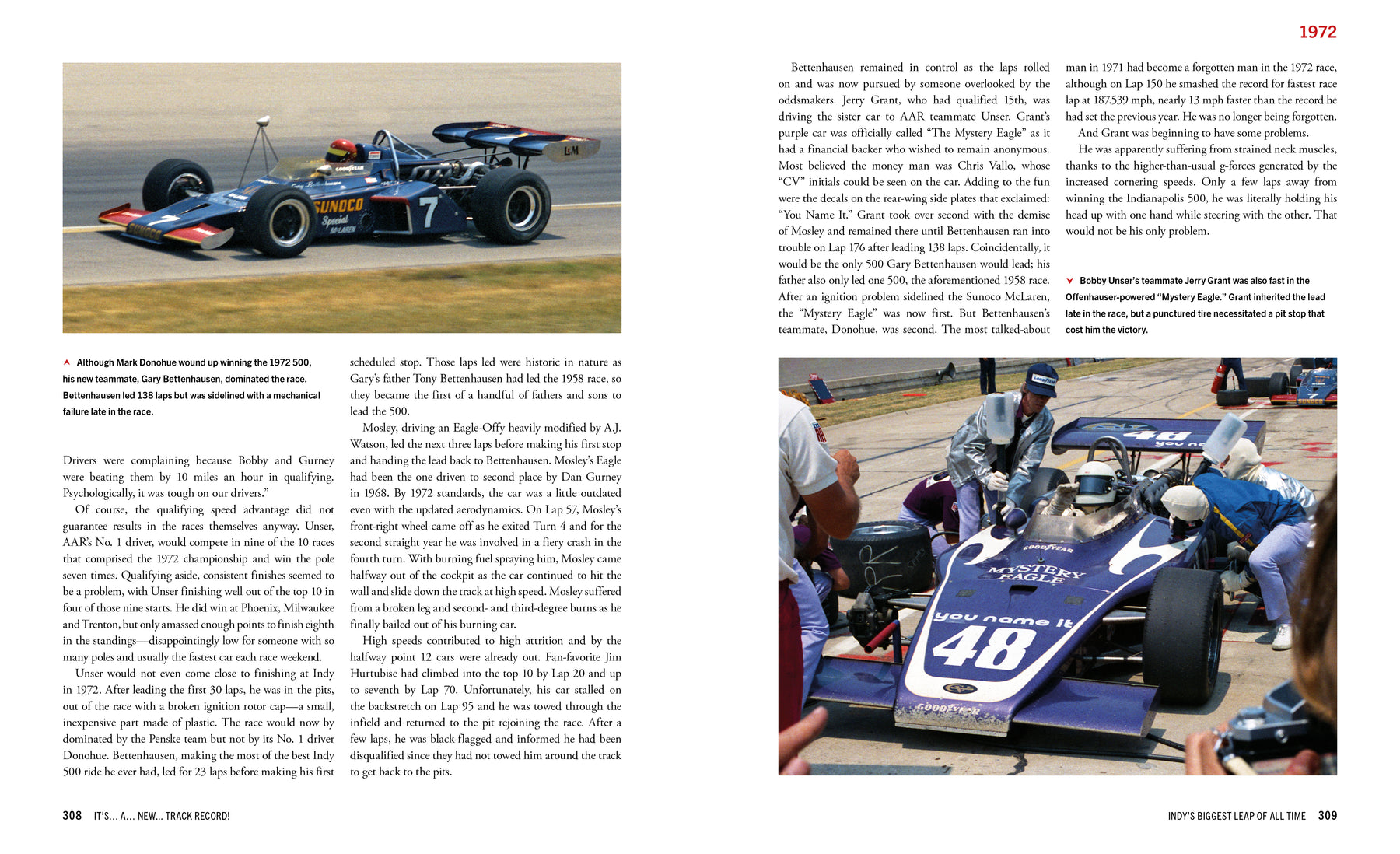 • While Mark Donohue won the 1972 Indy 500 in a McLaren, qualifying brought the biggest-ever leap in speeds with Bobby Unser’s 195.940 mph in his Eagle exceeding the previous record by an incredible 17 mph, resulting in the 180-mph and 190-mph barriers both being broken in the same year.
