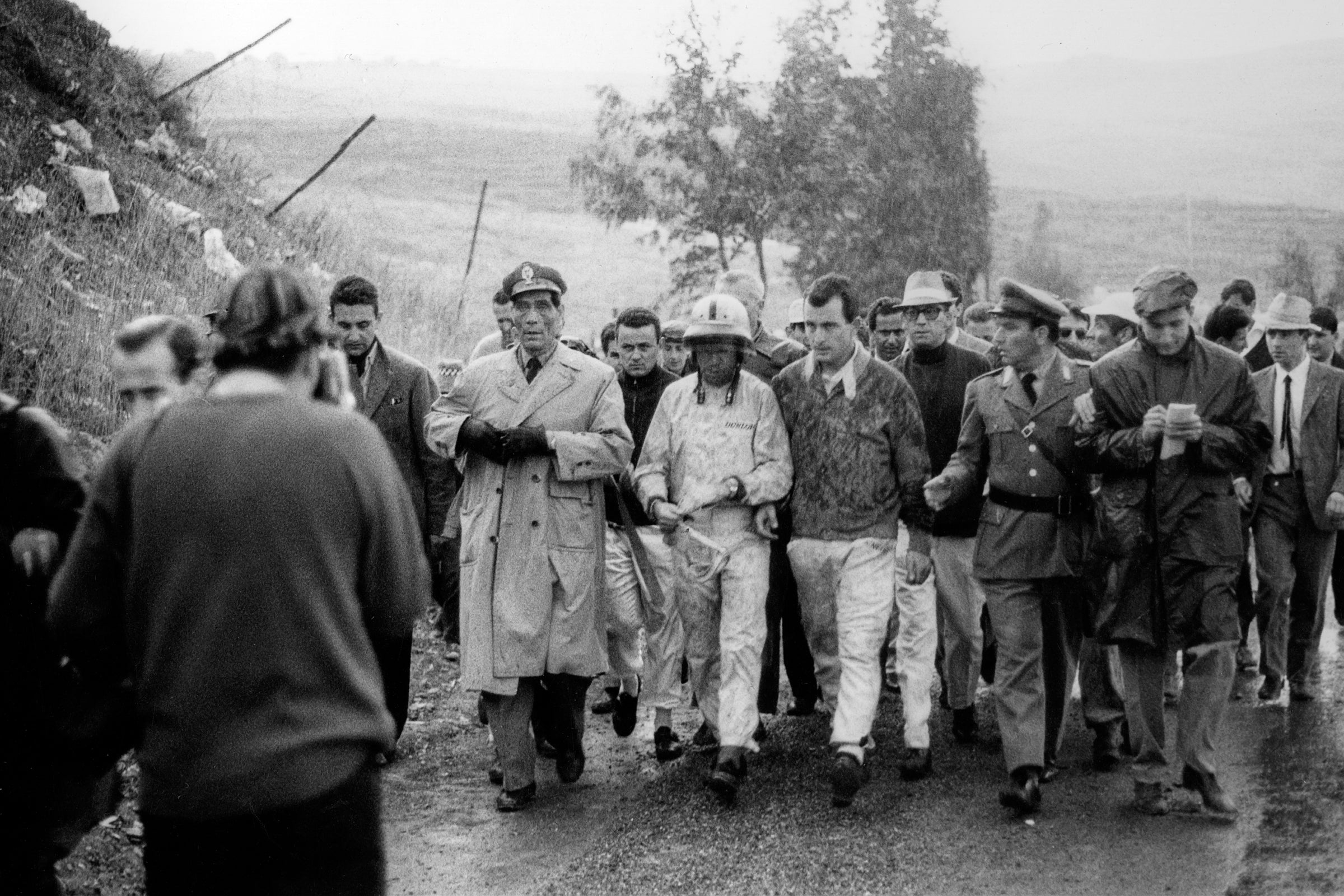 With cars starting in numerical order at intervals, a visibly edgy Hill (#164) roared off in pursuit of von Trips (#162) and Rodríguez (#160). He caught von Trips near Bivio Polizzi and tried to muscle his way past, rightly judging that he was being held up. The result was contact and a spin that ended with Hill’s car pointing the wrong way. Helped by a handful of spectators, Hill was soon turned around and shot off after von Trips, whom he sliced past without difficulty before setting off after Rodríguez. He overtook the Mexican near Collesano after some 35 miles of pedal-to-metal motoring. But that was as far as he got. In the downhill section leading towards Campofelice, Hill came into a corner far too quickly, shot off the road and slammed into a wall, inflicting terminal damage on his 246 SP. It was a rare — very rare — accident in his career, but it occurred just as von Trips was stunning everybody with his own performance.