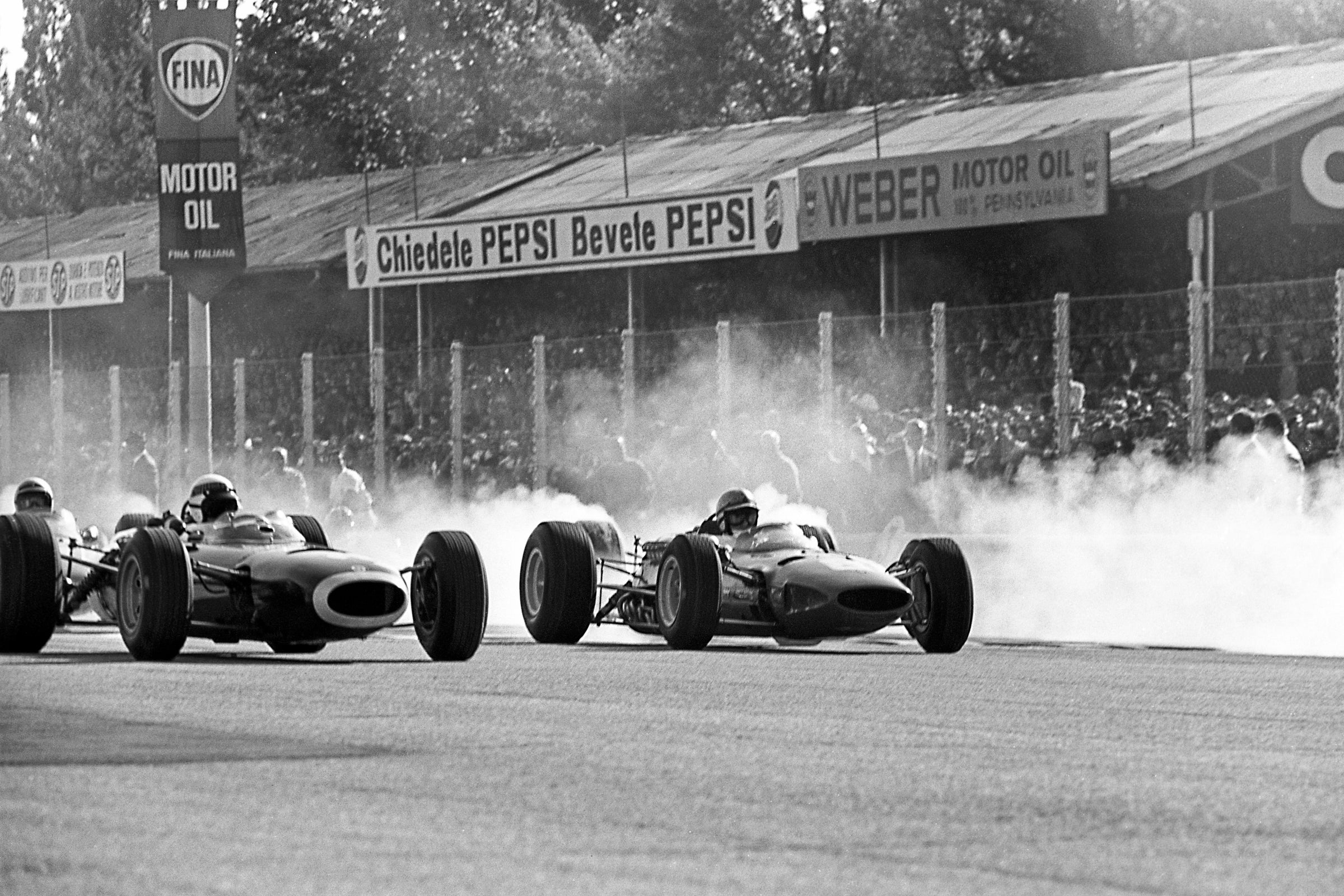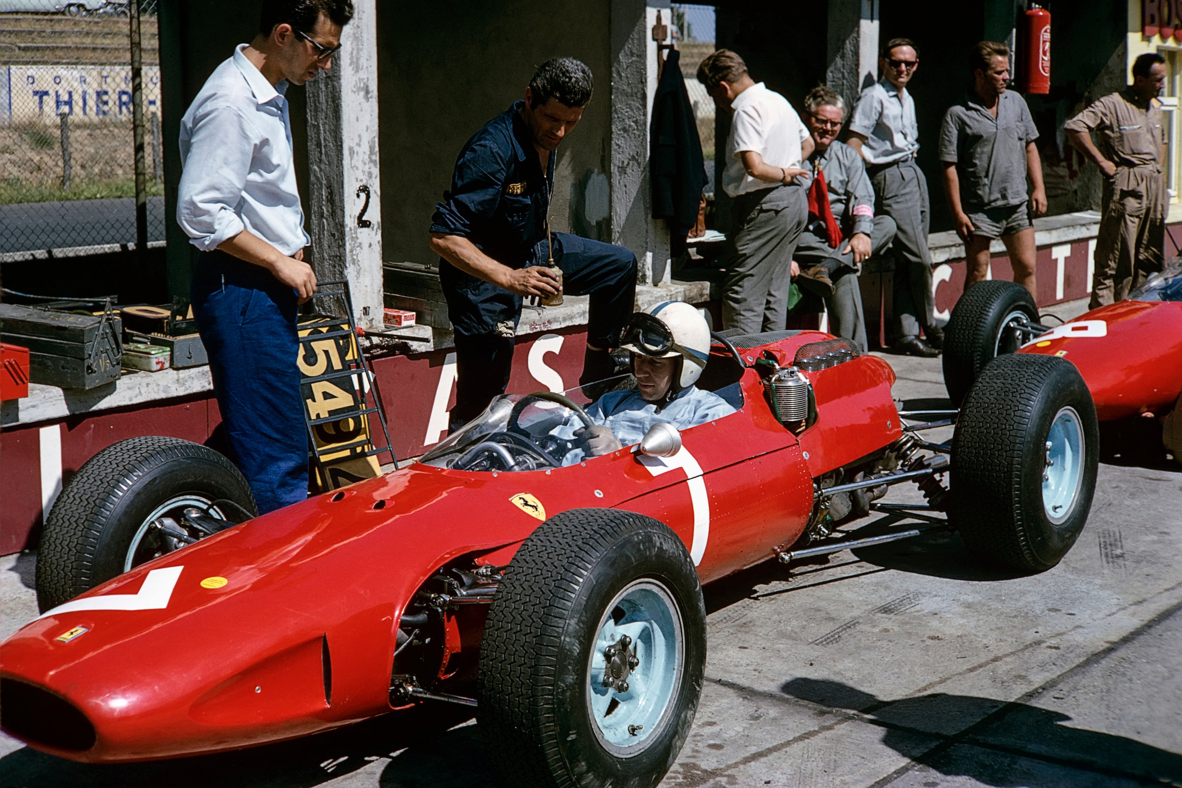 Less than a week later, the Zandvoort sand dunes replaced the winding Monaco streets for the first practice session of the Dutch Grand Prix, which was scheduled to be held on Monday. If the late arrival of the transporter from Maranello meant that Ferrari’s rivals had the track to themselves early on, their respite was short-lived when the three 120-degree V6 156s ventured out just after midday. Two sessions later the evidence of their crushing domination was plain for all to see in an all-Ferrari front row, with Phil Hill on pole for only the second time in his career, Wolfgang von Trips second with the same time (1m 35.7s) and Richie Ginther third (1m 35.9s). Behind them came Stirling Moss’s Lotus (1m 36.2s), Graham Hill’s BRM (1m 36.3s) and Dan Gurney’s Porsche (1m 36.4s).